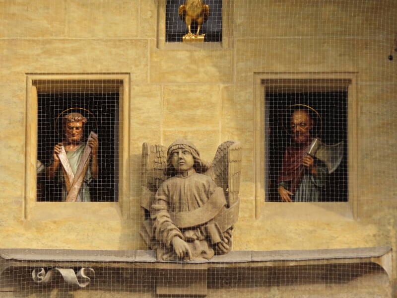 In a parade, the twelve apostles appear on stage, nodding as they pass by from left to right. They were added in 1865 together with the calendar dial. After all the apostles have made their appearance, the doors close and the golden rooster has its one shot at its second of fame: it crows one time.
