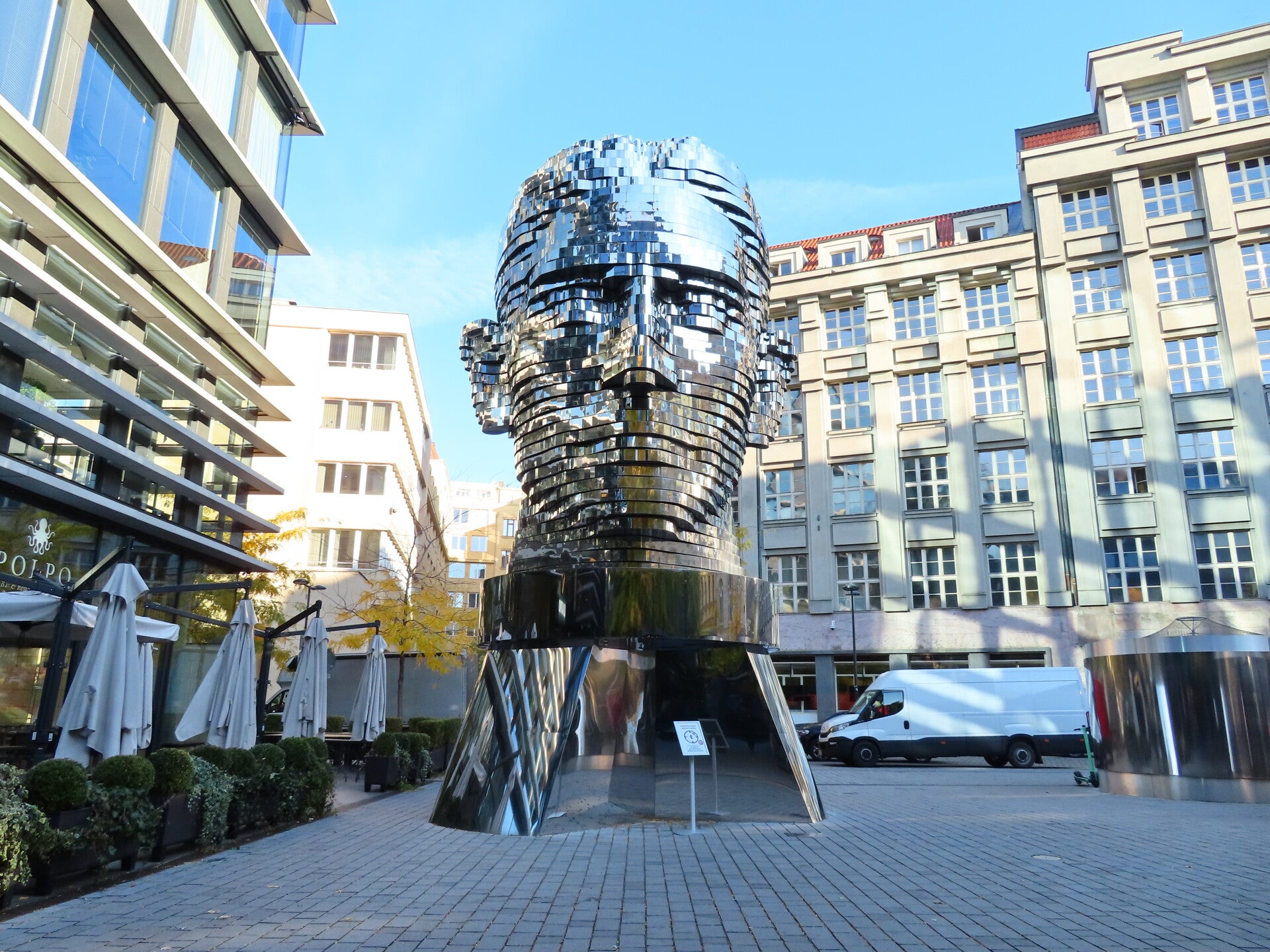 Kafka's head is made up of 42 different stainless steel plates, which can move independently of each other. This symbolizes the complexity and depth of Kafka's literary works, in which the line between reality and absurdity often blurs.