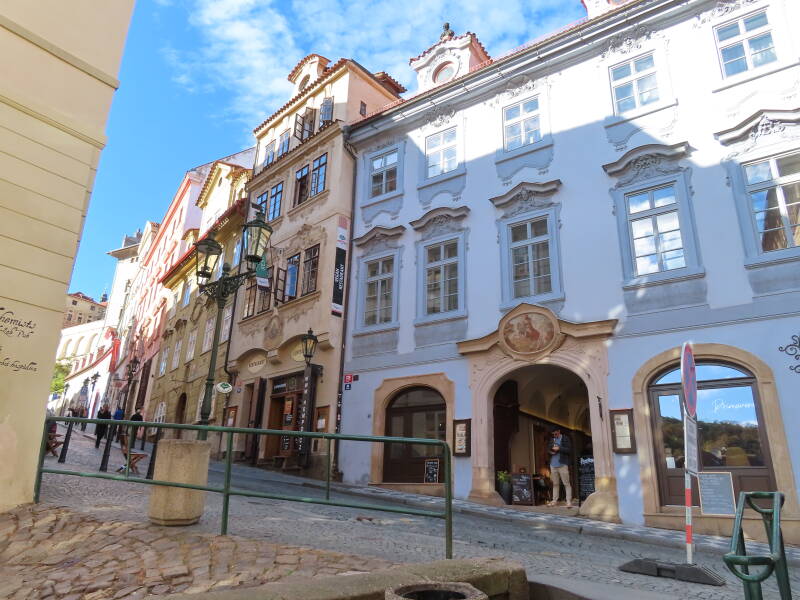 Alright, let's follow the blue line on the map again. As you walk down Nerudova, you’re surrounded by touristy charm and parked cars on either side. Let go of that image; focus on looking up, and you’ll see only the beautiful facades, cobblestones, and authentic Prague. By the way, take a moment to look to the left halfway down the street at the Italian Embassy - it's stunning!