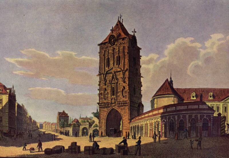 The founding of the New Town by Charles IV in 1348 rendered the city walls and Ambrosius Gate unnecessary as defensive structures. As the Ambrosius Gate fell into disrepair, it became a source of shame for both the city and the king, according to the councilors of the Old Town. In response, they made the bold decision to demolish it and construct a new gate to serve as a dignified calling card for the Old Town.